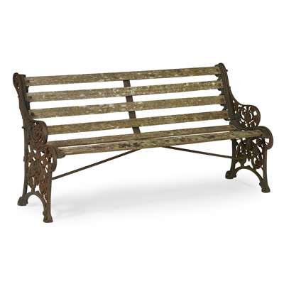 with wood slatted back and seat, the cast iron ends marked 'COALBROOKDALE'