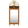 the rectangular mirror plate in a mahogany frame with gilt mouldings and painted frieze panel depicting a couple in a garden, surmounted by an urn and floral scrolls cresting