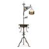 the open scroll tripod base with a brass basin and supporting a wrythen and knopped upright with two pricket platforms and a swing arm with a triangular pierced panel with fleur de lis and surmounted by further fleur de lis finial, suspending a shaped oval bowl with a trefoil swing handle