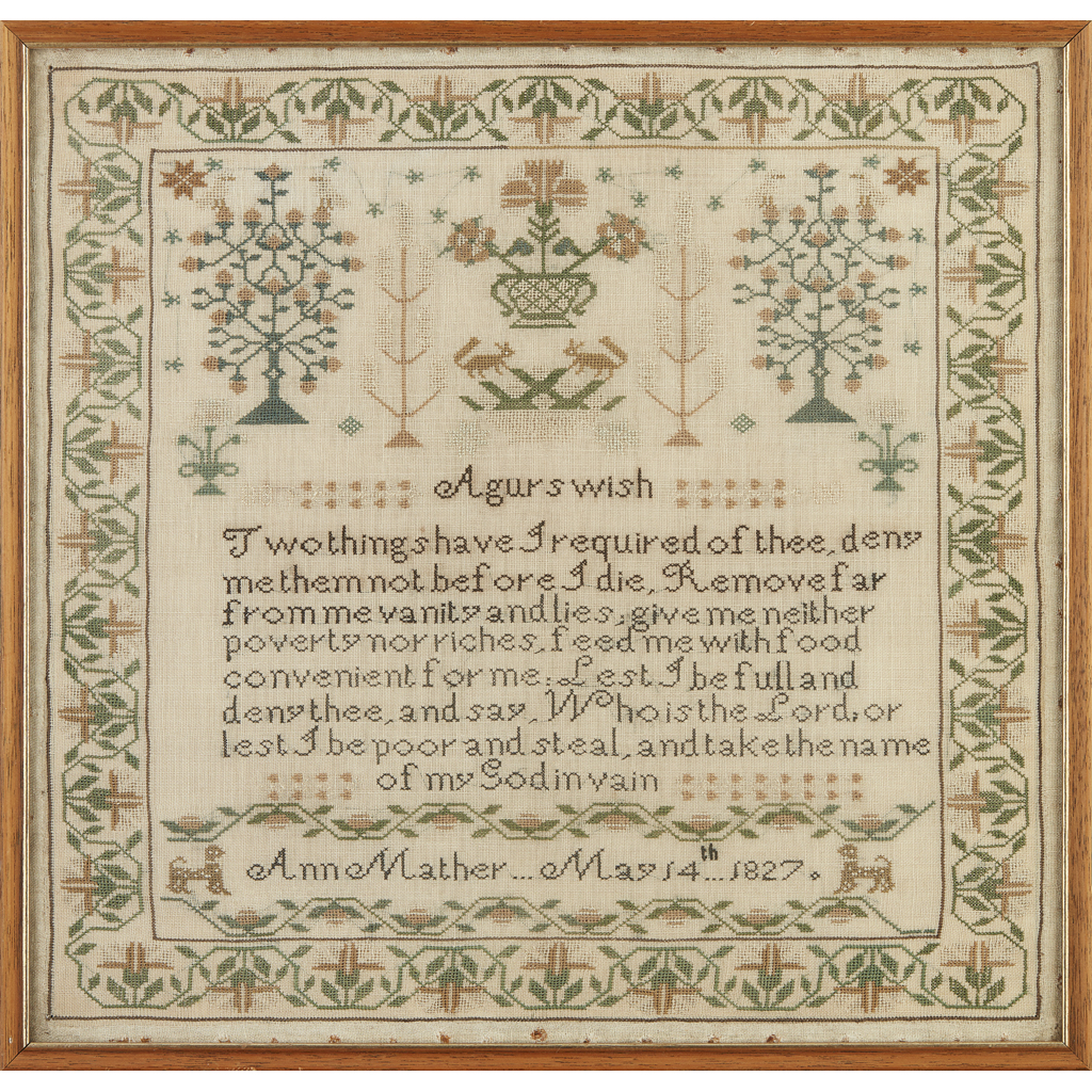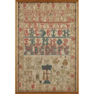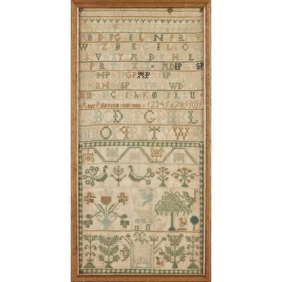 comprising an example by Anne Paterson, June 1800, with an alphabet, numbers, birds and a house, 43cm x 20cm; another by Anne Mather, May 14 1827, depicting flowers, trees and a verse, 43cm x 44.5cm; and a third dated 1778, with initials EM, with alphabet and numbers above Adam and Eve, 44cm x 29cm; all framed (3)