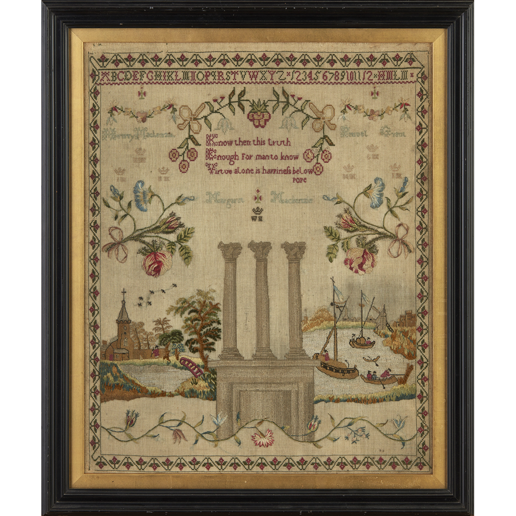 with an alphabet above the names HENRY MACKENZIE and PANUEL GRANT and a verse, with the author's name MARGARET MACKENZIE, flanked by silkwork flowers, above three columns and scenes of a church and boats, in an ebonised frame