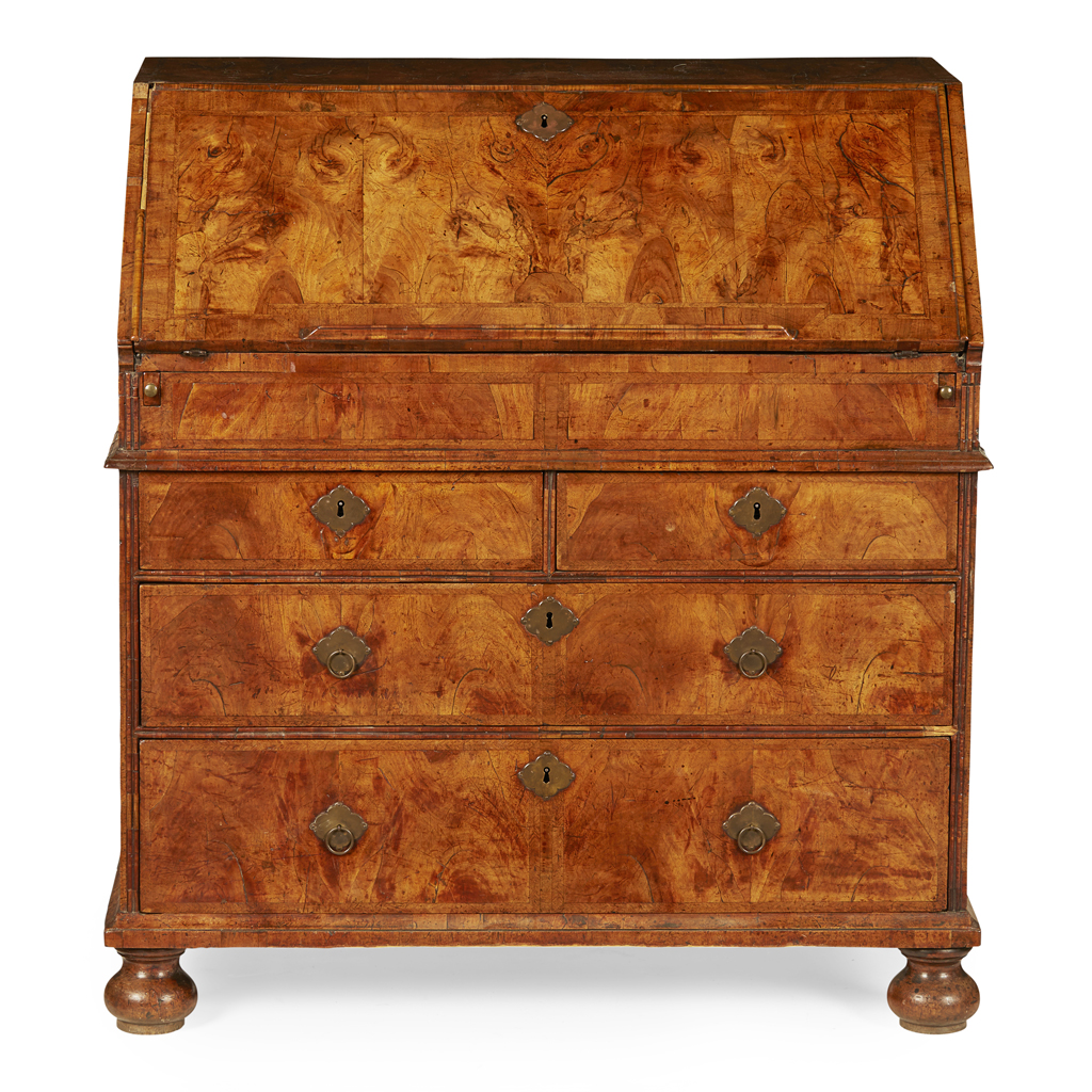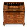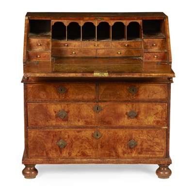 with herringbone stringing and cross banding, the slant front enclosing an interior fitted with drawers and pigeon holes and an inset writing surface and a well; above two short and two long drawers, raised on bun feet