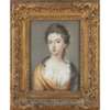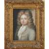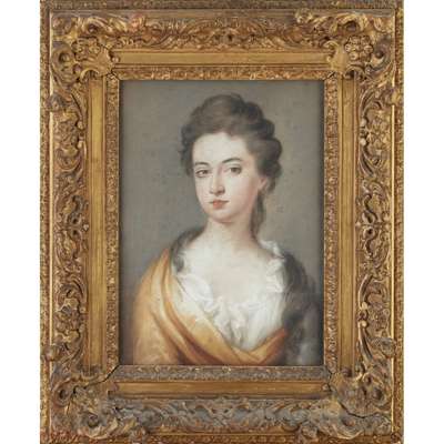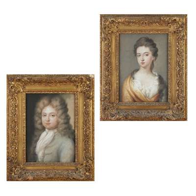 the gentleman with a powdered wig and light blue coat; the lady with a white chemise and yellow cloak, in giltwood frames (2)