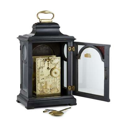 the bell top case with a brass handle above an arched dial with the painted figure of Chronos to the arch, the silver chapter with Roman and Arabic chapters and a mock pendulum aperture and one winding hole, the non-striking movement with anchor escapement and an engraved backplate