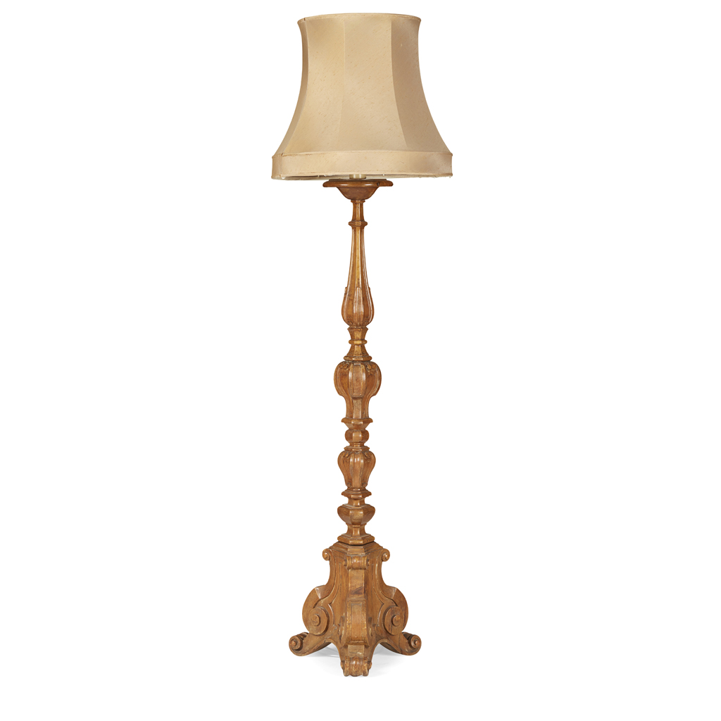 in the Renaissance style, the triform column carved with palmettes, scrolled brackets, converted to a standard lamp