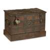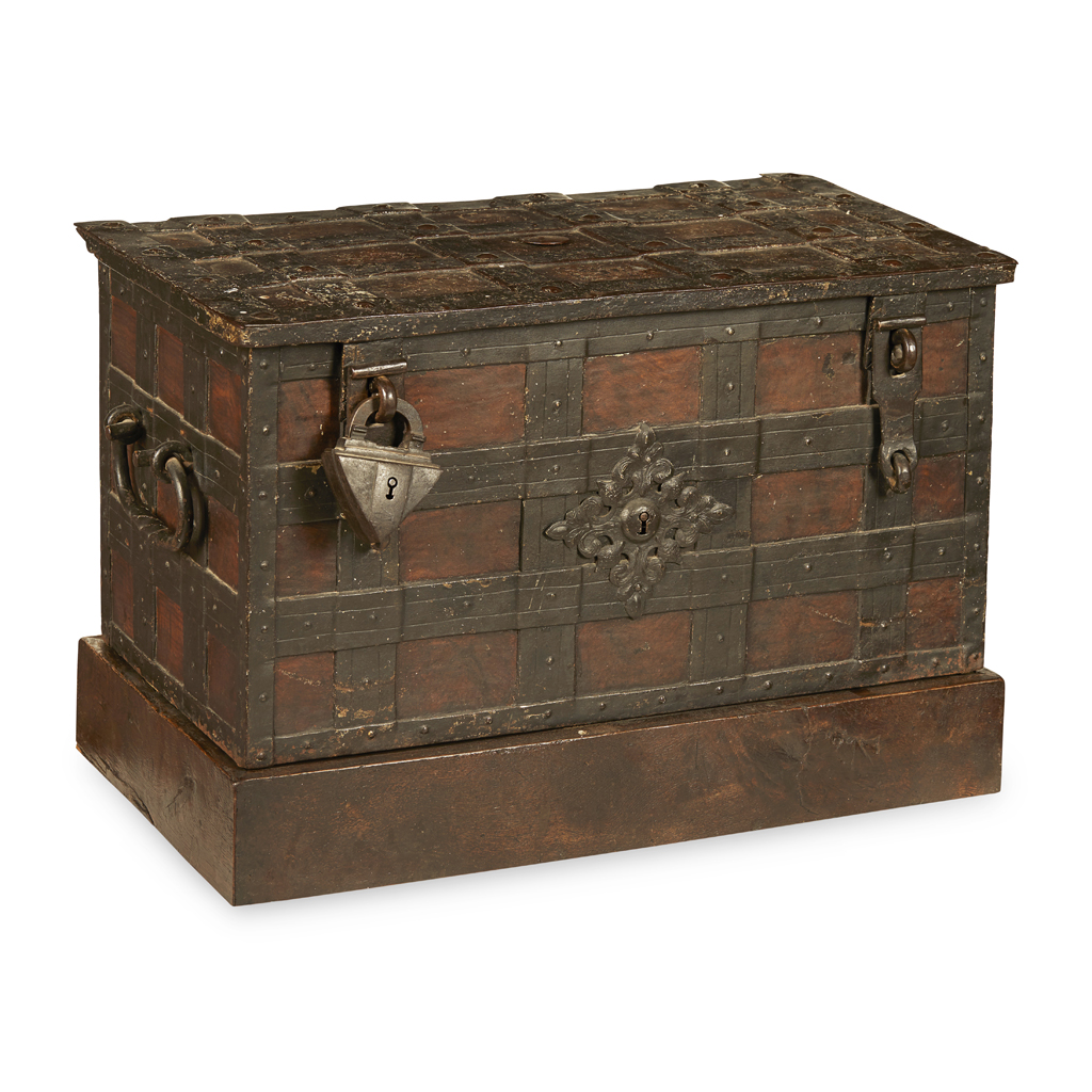 the hinged strap banded top with a central lock and iron handles, two keys and a padlock, on a separate plinth base