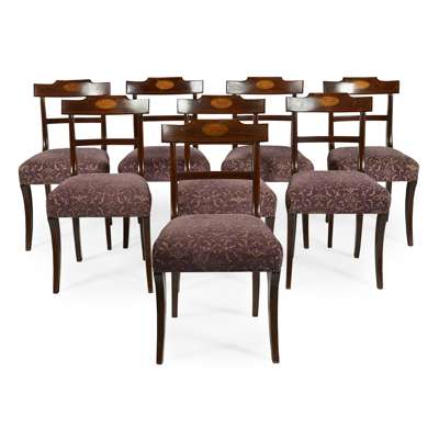SET OF EIGHT REGENCY STYLE MAHOGANY AND INLAY DINING CHAIRS