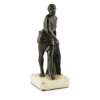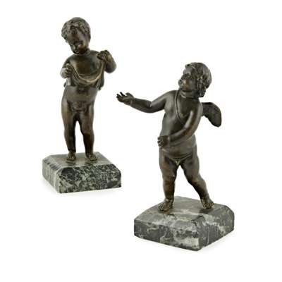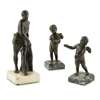 dark brown patina, raised on a square white marble base, 18cm high; together with TWO 18TH CENTURY BRONZE FIGURES OF PUTTI on square green marble bases, 14.5cm high (3)