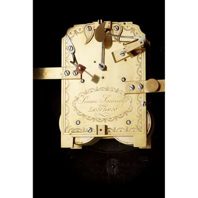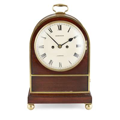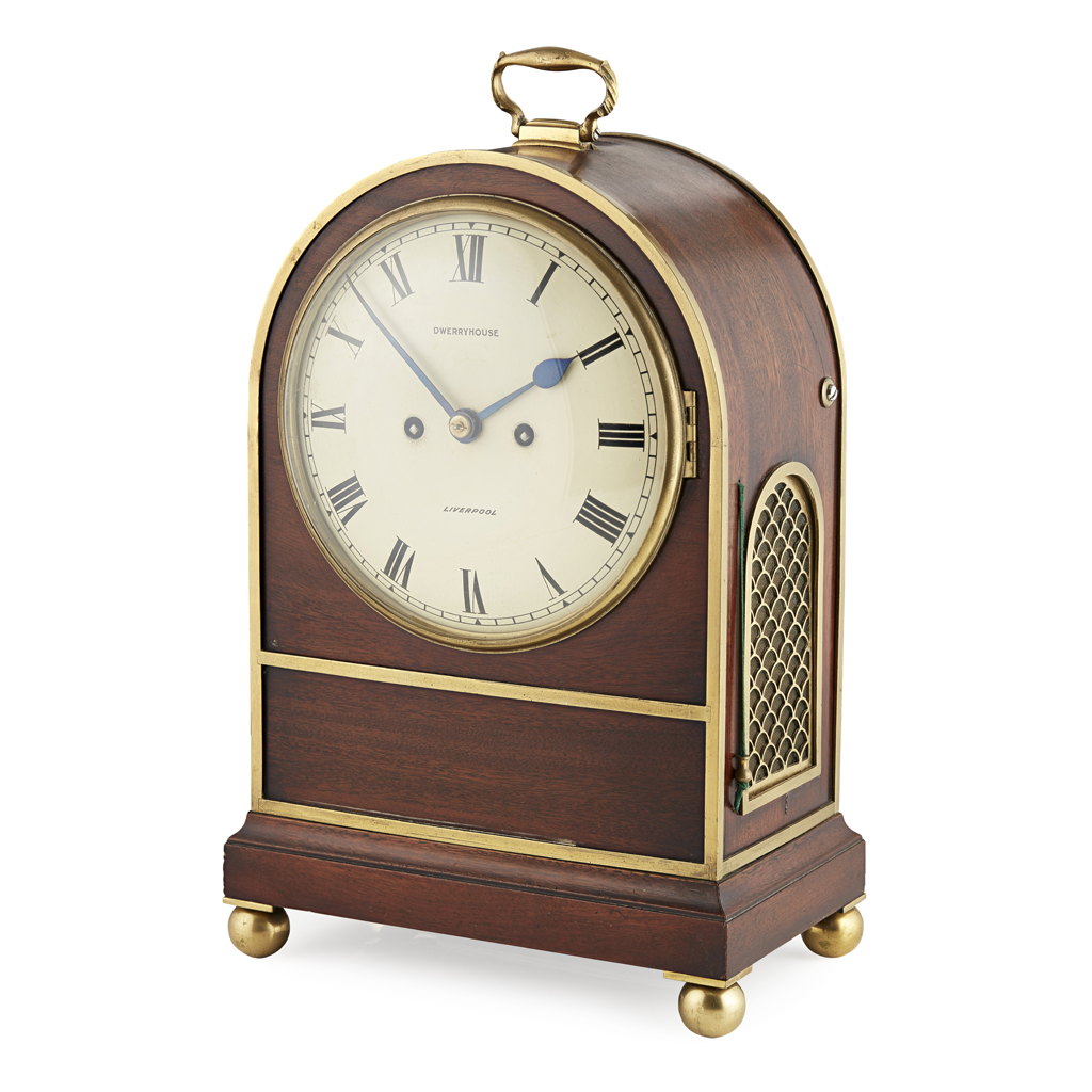 the arched top fitted with a handle, enclosing a cream enamelled dial with Roman numerals, inscribed DWERRYHOUSE/ LIVERPOOL, the engraved movement signed SIMON SAMUEL/LONDON, with an anchor escapement and striking a bell, raised on gilt ball feet