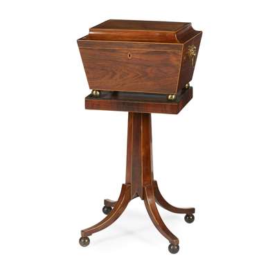 REGENCY ROSEWOOD AND MARQUETRY TEAPOY ON STAND Y