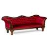 the serpentine channel moulded top rail carved with lotus above a button upholstered back and high scroll arms, raised on lotus carved feet, in red plush upholstery