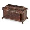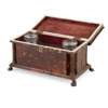 of sarcophagus form with columns set to the corners, the hinged cover mounted with a white metal plaque, opening to a red velvet-lined interior fitted with two hobnail cut glass containers with associated stoppers, raised on brass lion paw feet