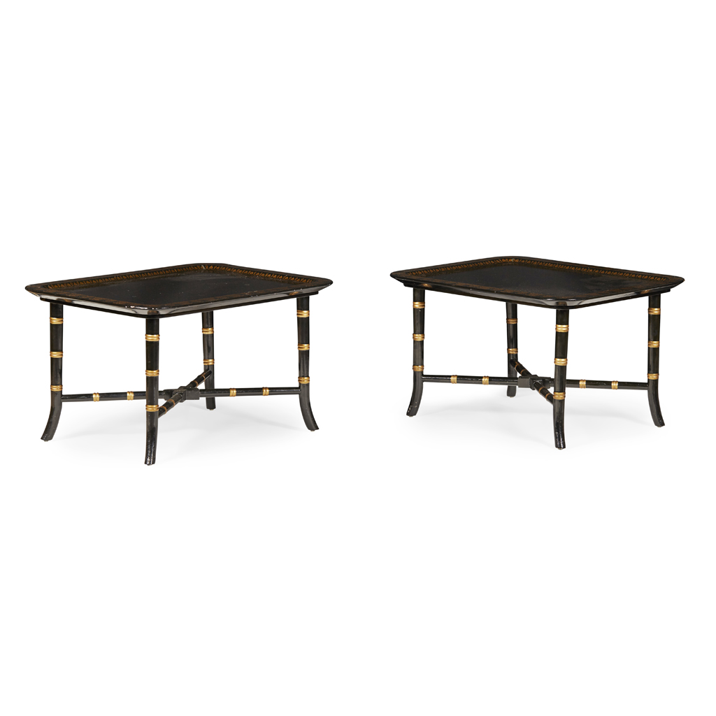 PAIR OF REGENCY STYLE EBONISED AND GILT TRAY TOP TABLES