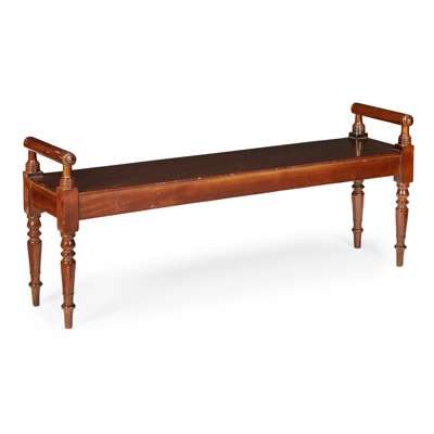 the long rectangular seat flanked by turned cylinder arms, raised on turned and tapered legs