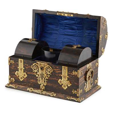 FINE VICTORIAN COROMANDEL AND BRASS TEA CADDY, JENNER AND KNEWSTUB, LONDON