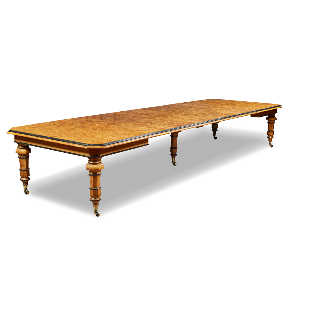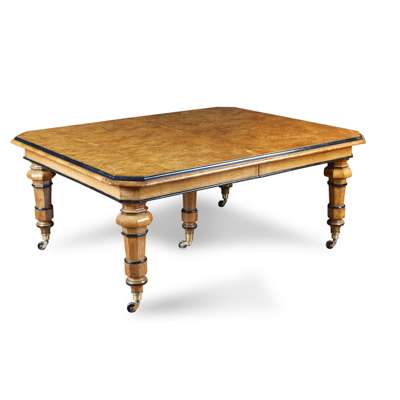 the rectangular highly figured top with canted corners and an ebonised moulded edge, above a plain moulded frieze, raised on facetted baluster legs with ebonised bands and ending in large patent brass castors, the winding mahogany frame with six leaf extensions
