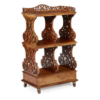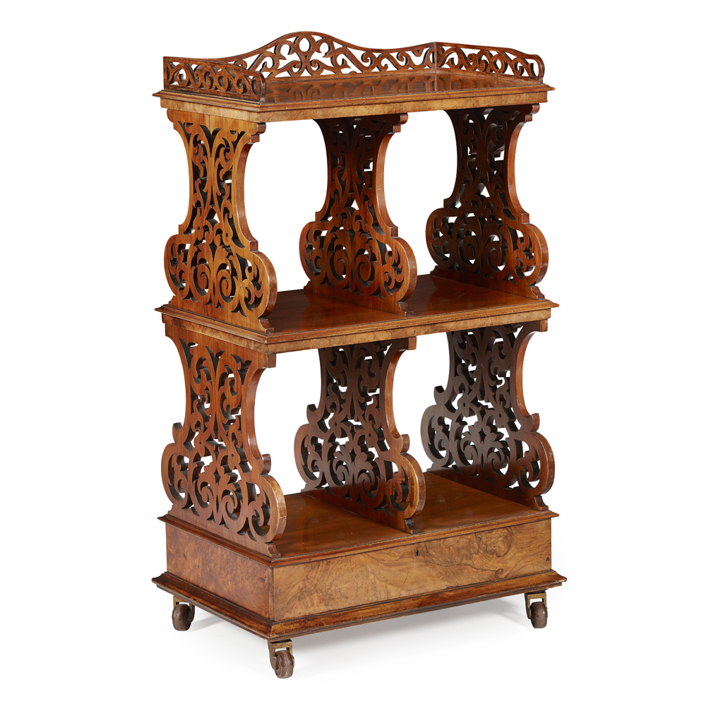 with three rectangular tiers raised and divided by pierced and scroll carved waisted supports, on a plinth base with a long drawer, on ceramic castors, stencilled maker stamp to the drawer 'FROM C FREEMANS/ FURNITURE MANUFACTORY/ 17 LONDON STREET NORWICH'