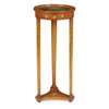 the circular glazed top above a green velvet lined interior, raised on three square tapered legs and triform base, painted all-over with flower trails and swags and a musical trophy