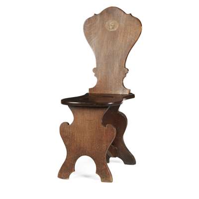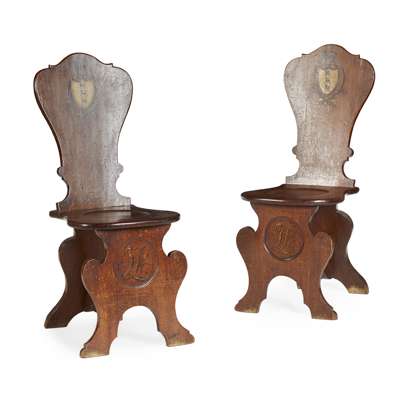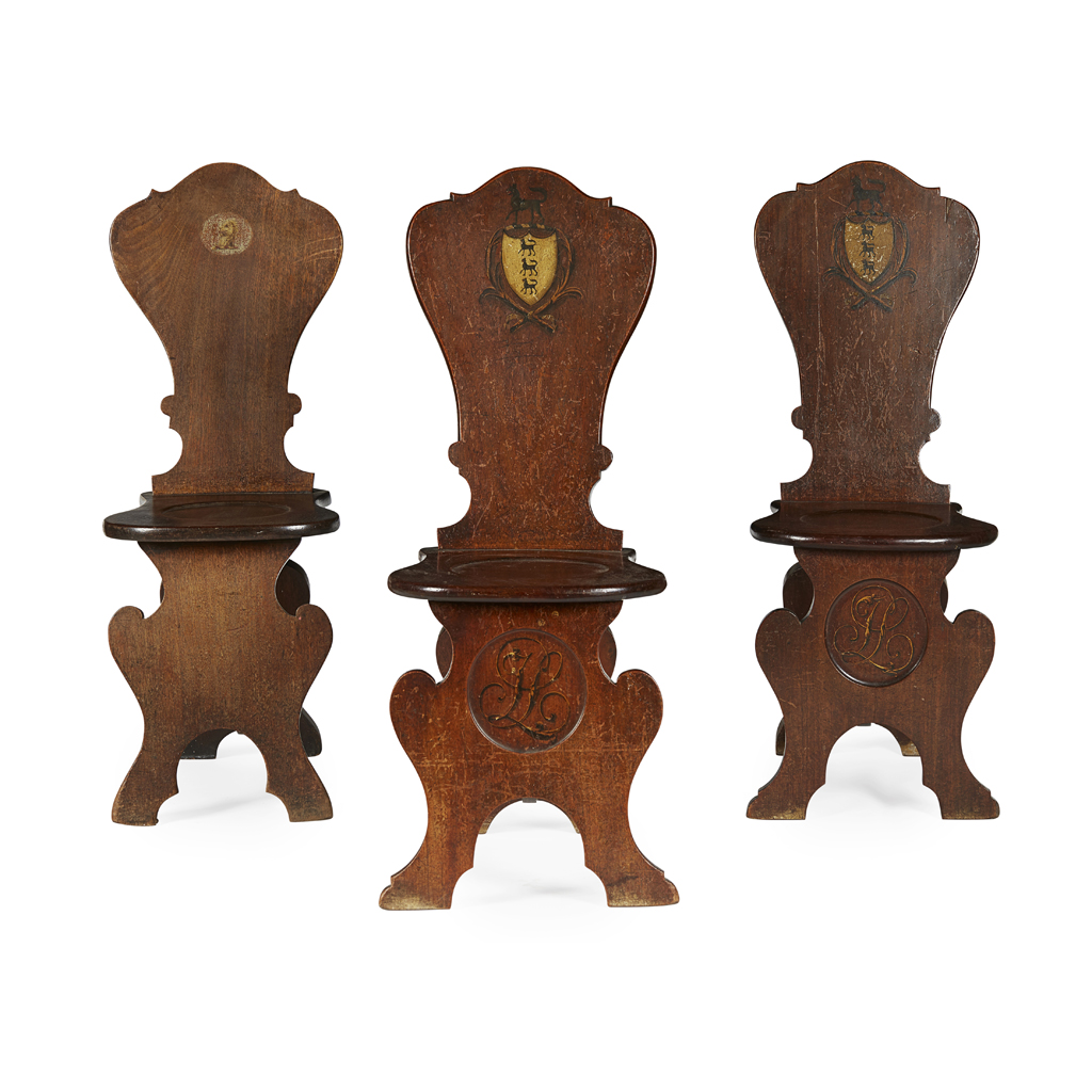 comprising a pair painted with heraldic shields, and another with a painted armorial, over shaped dished seats, raised on scrolled panel fronts and back supports (3)