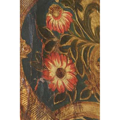 each arched panel decorated with flower-filled urns, cartouches and C scrolls