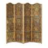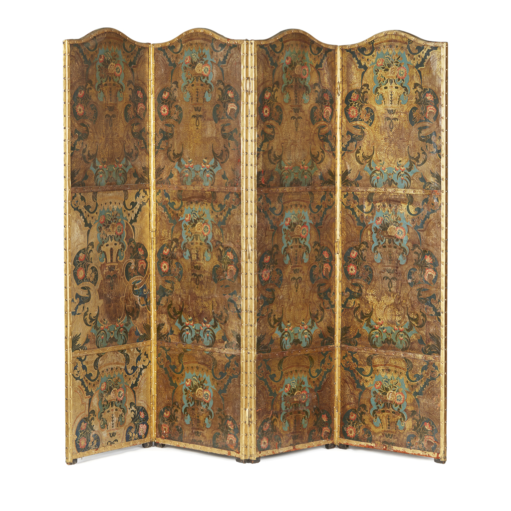 CONTINENTAL POLYCHROMED LEATHER AND PARCEL GILT FOUR-PANEL SCREEN