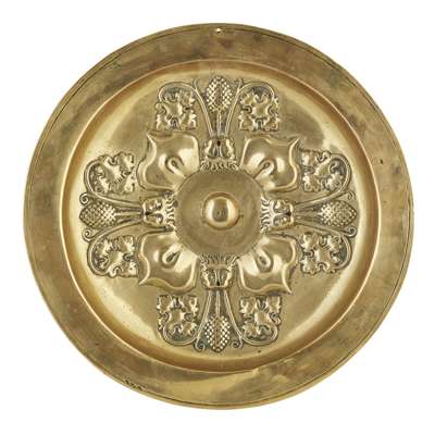 of circular form, the central boss enclosed by embossed pierced lion masks issuing fruiting vines, within a flat border with punched decoration