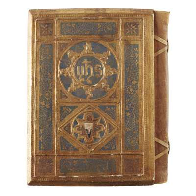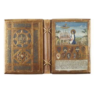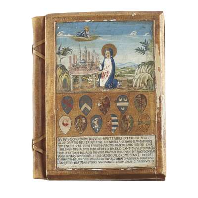 gessoed, gilt and painted boards joined by a leather spine, depicting the Virgin Mary kneeling by a depiction of Siena, and holding a parchment inscribed 'HEC EST CIUTA MEA' ('This is my city'), above two rows of coats of arms and commemorative inscription with lists of names; the reverse with a Christogram and foliate scrolls