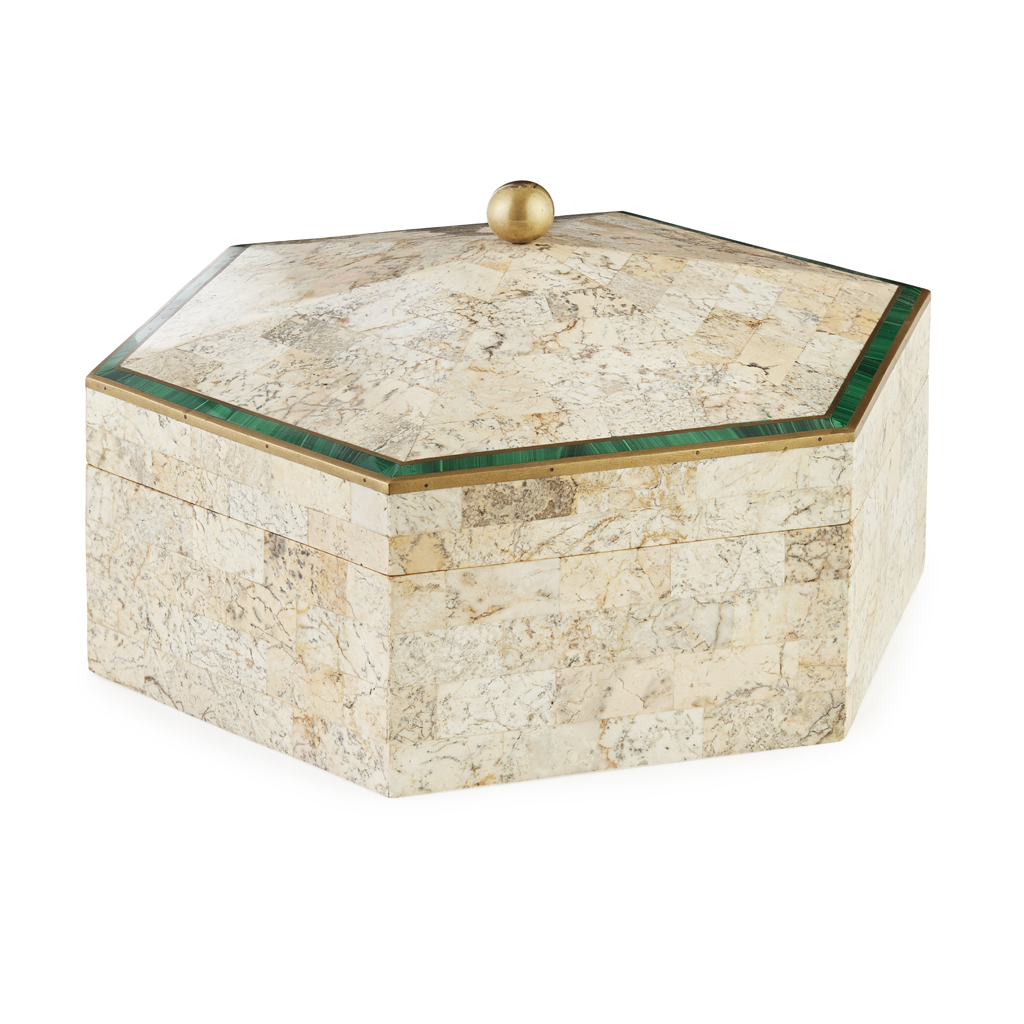 MARBLE VENEERED, MALACHITE AND BRASS HEXAGONAL BOX