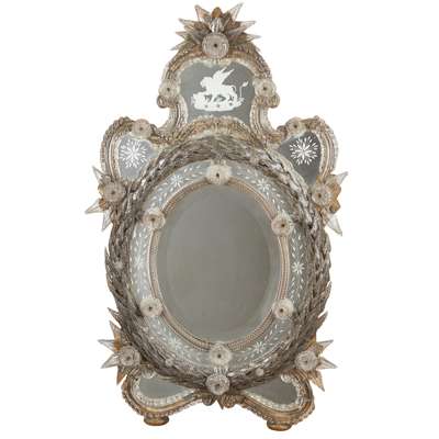 with applied flower heads and leaves enclosing etched glass margin plates depicting flower swags and the Lion of Saint Mark, and an oval bevelled mirror plate