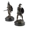 dark brown patina, raised on circular black marble bases; the first with a targe and axe, 33cm high; the second, brandishing a sword, 33.5cm high (2)