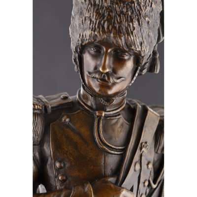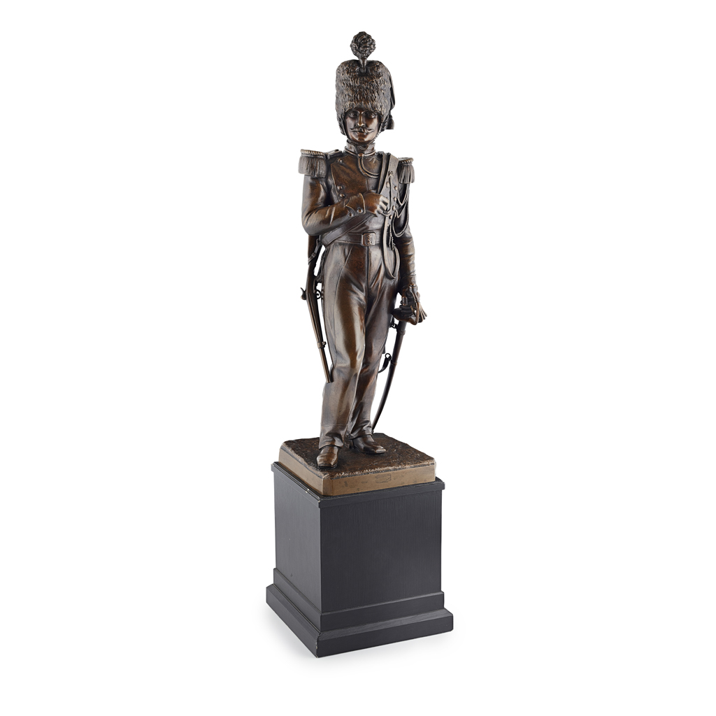 light brown patina, in full uniform with a sword and gun, with indistinct foundry pastille and incised CIE DE BRONZES/ BRUXELLE, on an associated ebony plinth