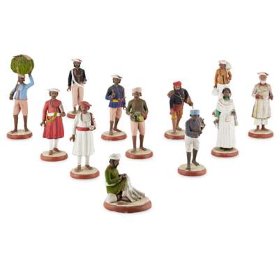 comprising eleven men and a woman, depicting various tradespeople and castes carrying fruit, bags and books, on circular bases with handwritten labels (12)
