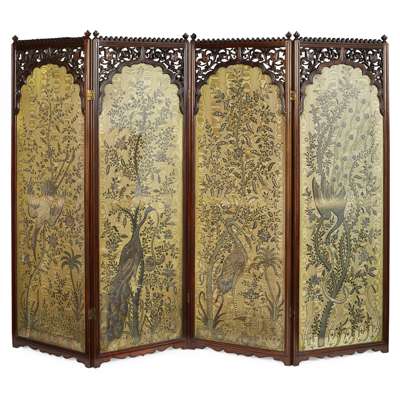 each panel with a crenelated top and pierced and foliate carved arched frieze above a yellow silk panel embroidered with peacocks, herons, fish, and snakes