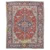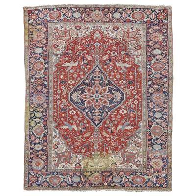 the red field with indigo and pink medallion, ivory spandrels, within indigo turtle palmette and vine border