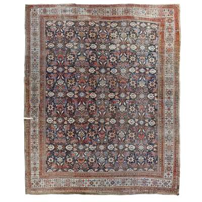 the abrash indigo field with allover rosette, palmette and serrated leaf pattern, within ivory star and vine border