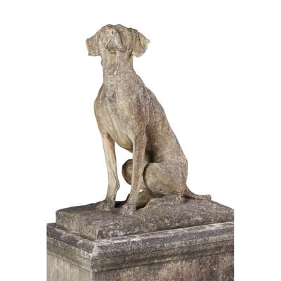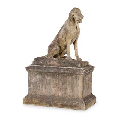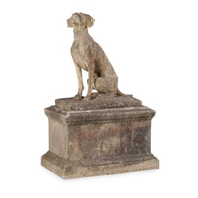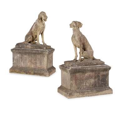 FINE PAIR OF COMPOSITION STONE FIGURES OF DOGS AND STANDS, AFTER A MODEL BY HENRI ALFRED MARIE JACQUEMART