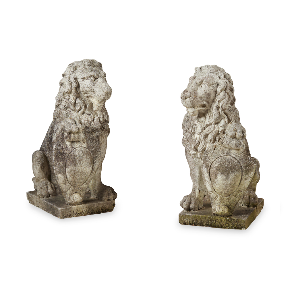 PAIR OF COMPOSITION STONE LIONS