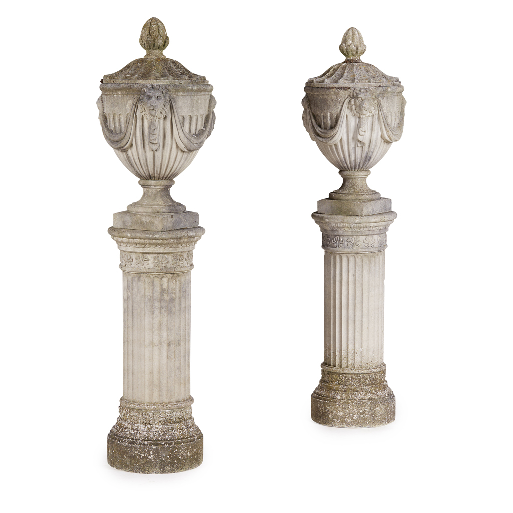 the covers with acorn finials above fluted bodies with drapery swags and lions' masks; on fluted columns with anthemion friezes and moulded plinths (2)