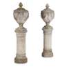 PAIR OF NEOCLASSICAL COMPOSITION STONE COVERED URNS AND PEDESTALS