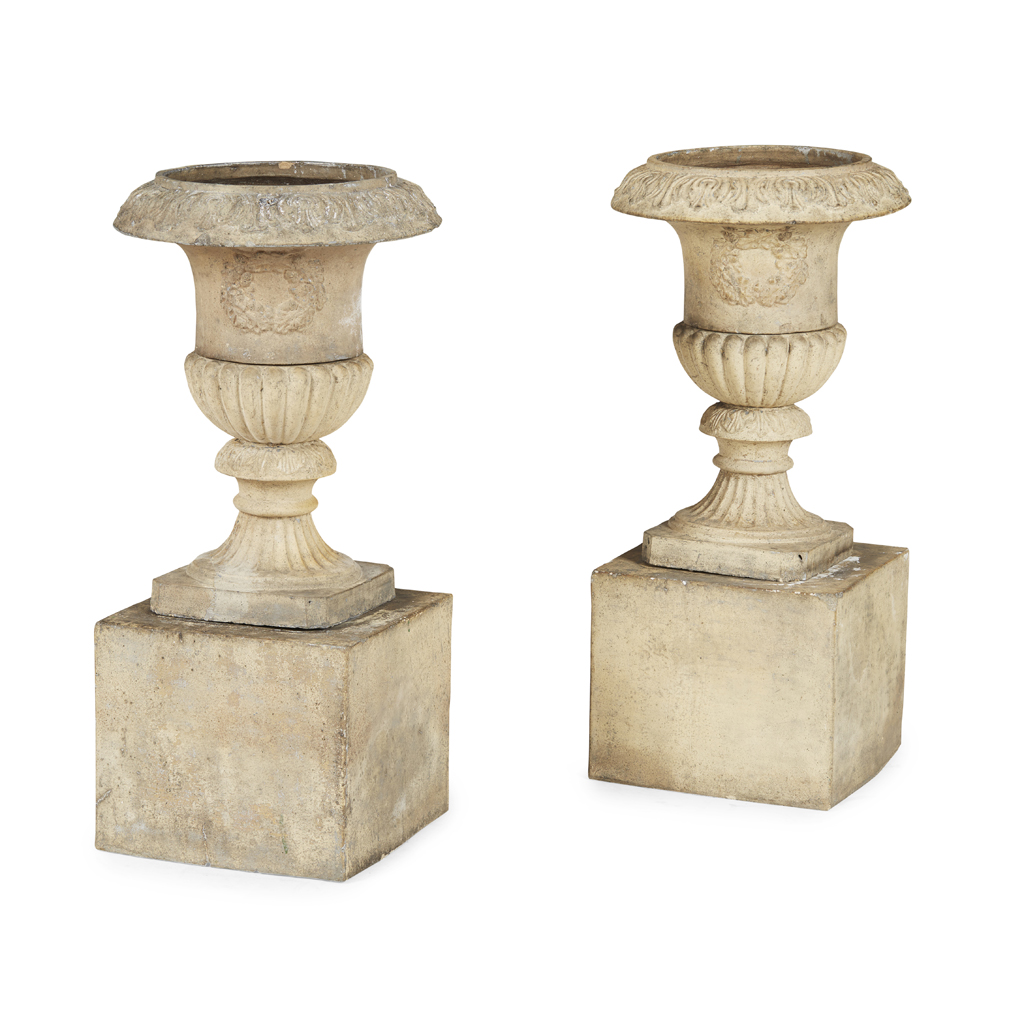of campana form with leaf moulded rims and socle bases, raised on separate square pedestals, one with script date 12/10/41 (2)
