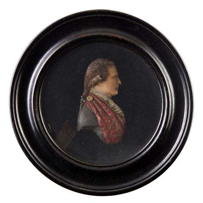 comprising Sir Walter Scott, on a rectangular black glass ground, paper labels verso, 10.5cm x 7.5cm; and four round bust-length portraits to include General Wolfe, Charles I, Sir William Hamilton, and a Scotsman, various labels to verso, largest 12cm diam. (5)