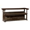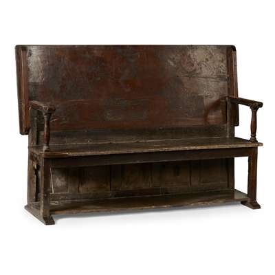 the three board rectangular top rising to form a seat back above a plank seat, flanked by open arms, raised on square supports with trestle bases joined by an undertier and enclosed panel back