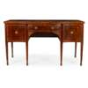 the serpentine crossbanded top centred by an urn inlaid medallion, above a centre drawer and arched recess with fan spandrels, flanked by two deep drawers, raised on square tapering legs ending in spade feet