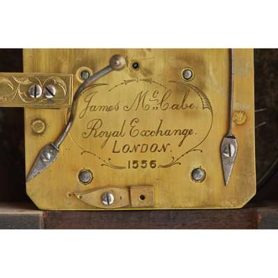 the circular enamelled Roman numeral dial with two winding holes, signed 'James McCabe/ Royal Exchange/ London', in an inverted bell top ebonised case with brass pine cone finials and pierced brass rose spandrels and fret panels to the sides, on an ogee moulded base with brass ball feet; the eight day double-fusee movement with anchor escapement and striking a bell, the backplate engraved 'James McCabe/ Royal Exchange/ London/ 1556'