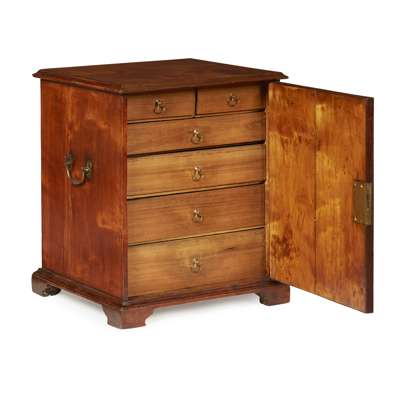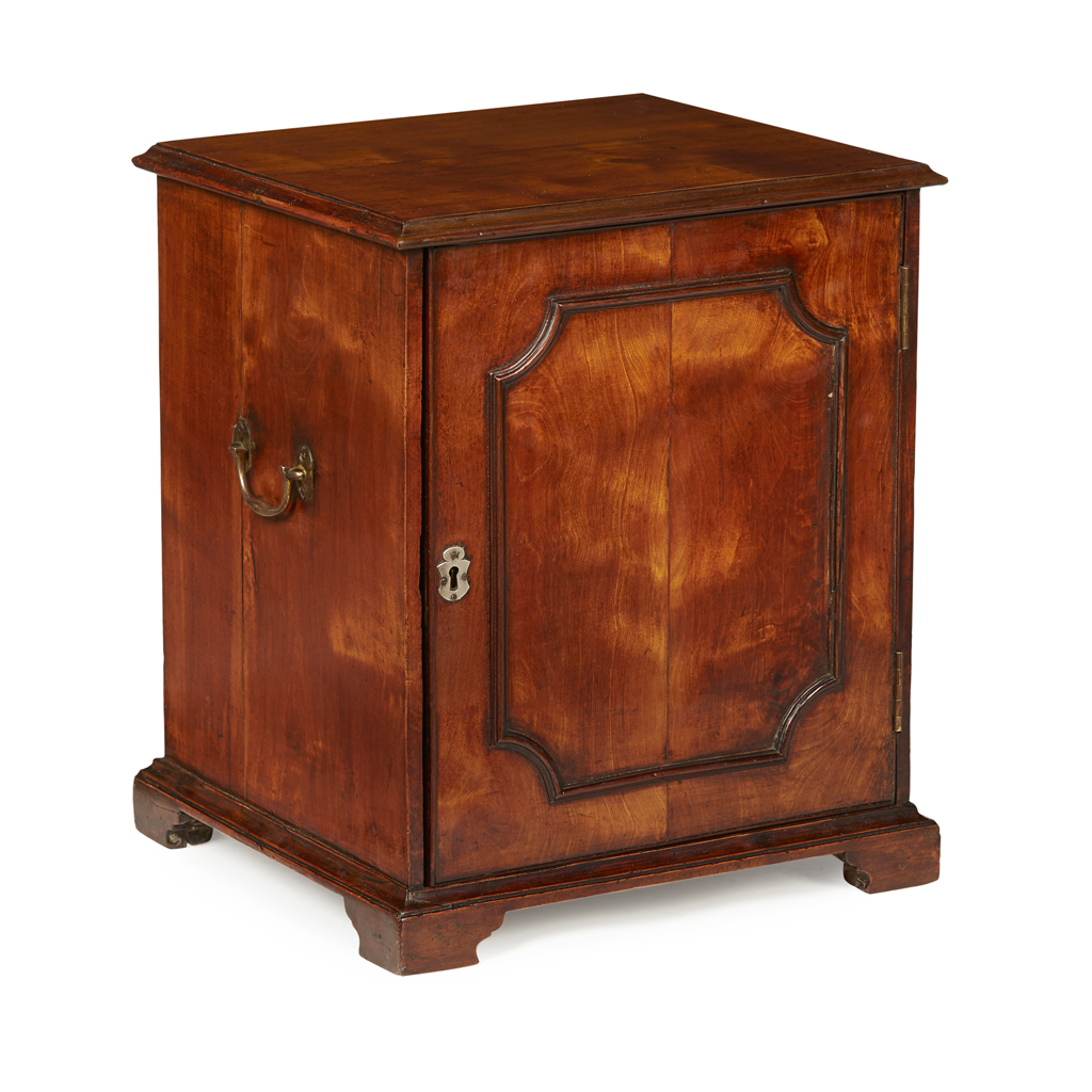 of cubic form, the moulded door opening to drawers, with brass handles to the sides, raised on bracket feet