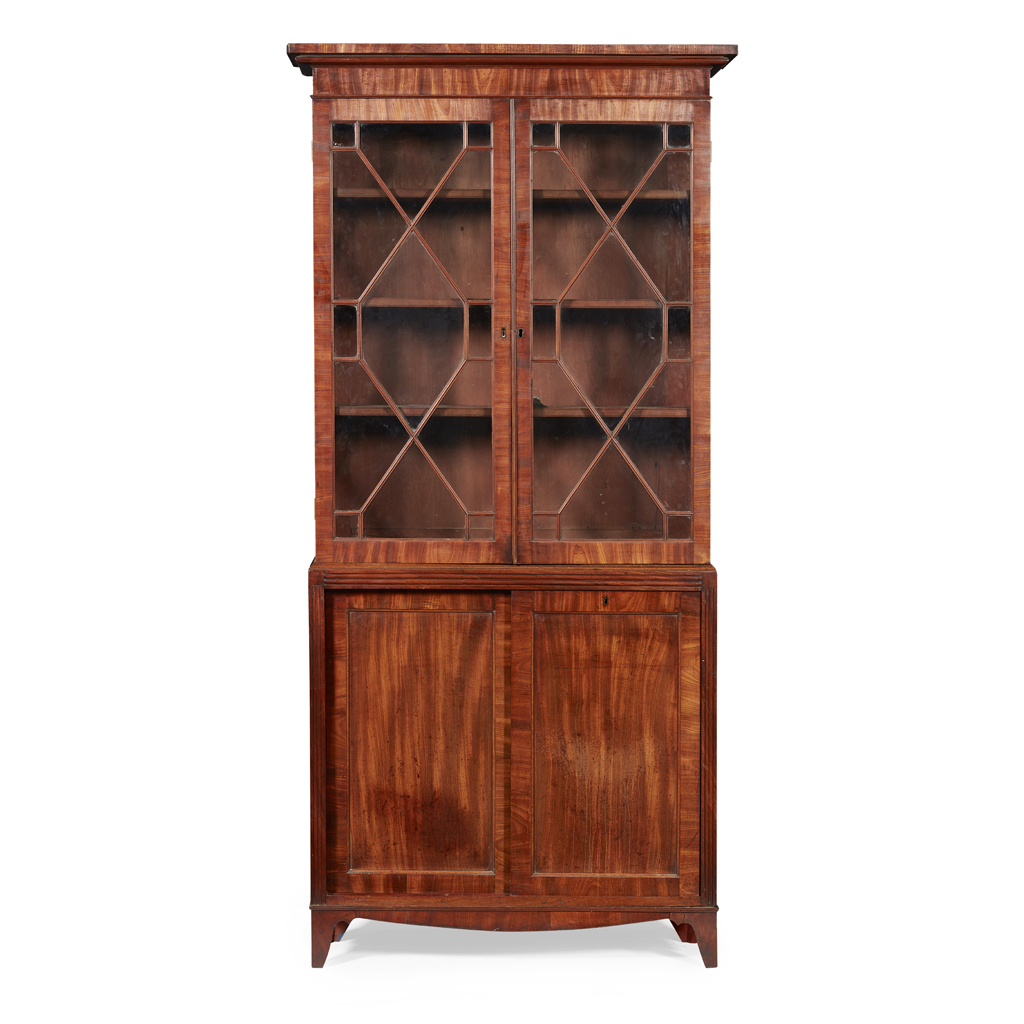 the projecting cornice above a pair of astragal glazed doors opening to adjustable shelves; the base with a pair of sliding panel moulded doors enclosed by reeded mouldings, raised on shaped bracket feet