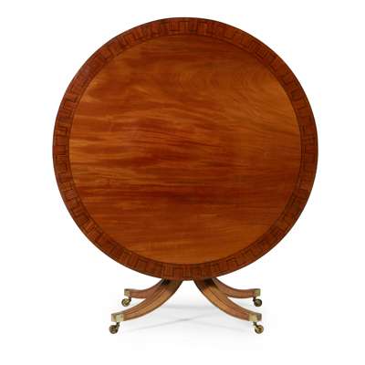 the crossbanded circular tilt top with ebonised Greek key inlay, on a tapered column support and four outswept reeded legs ending in brass caps and castors
