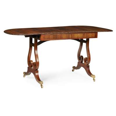 the rounded rectangular top with drop leaf ends and a foliate carved edge, above a reeded frieze with a drawer to each side, raised on scroll lyre end supports and arch braces, with outswept legs ending in foliate cast brass caps and castors