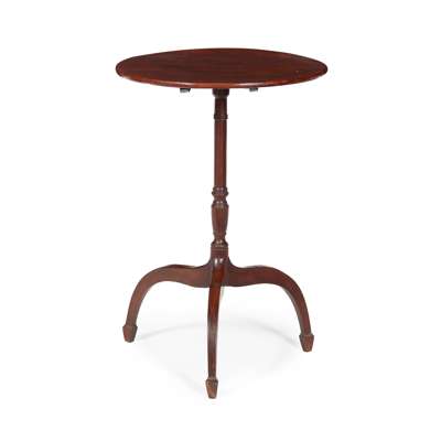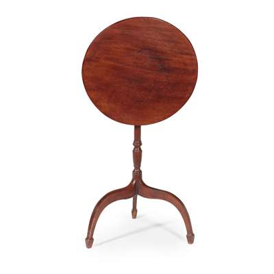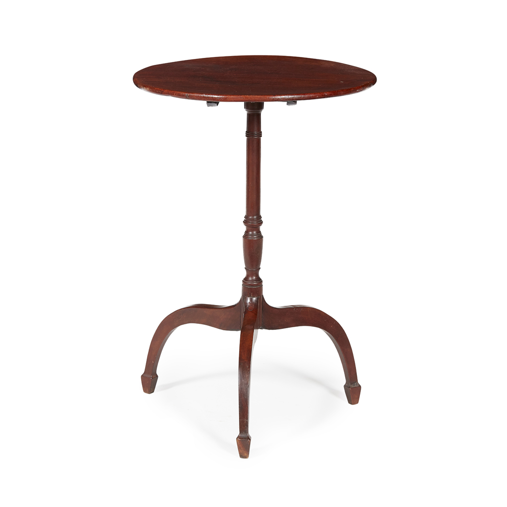 the rounded tilt top raised on a turned support and three outswept legs ending in spade feet