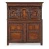 the projecting moulded cornice above a scroll carved frieze with initials 'RR,KL' and dated '1731', over three foliate and figural carved architectural arched panel doors flanked and divided by carved terms; the lower section with a pair of inlaid triple panel doors within a scroll carved frame, raised on stile feet